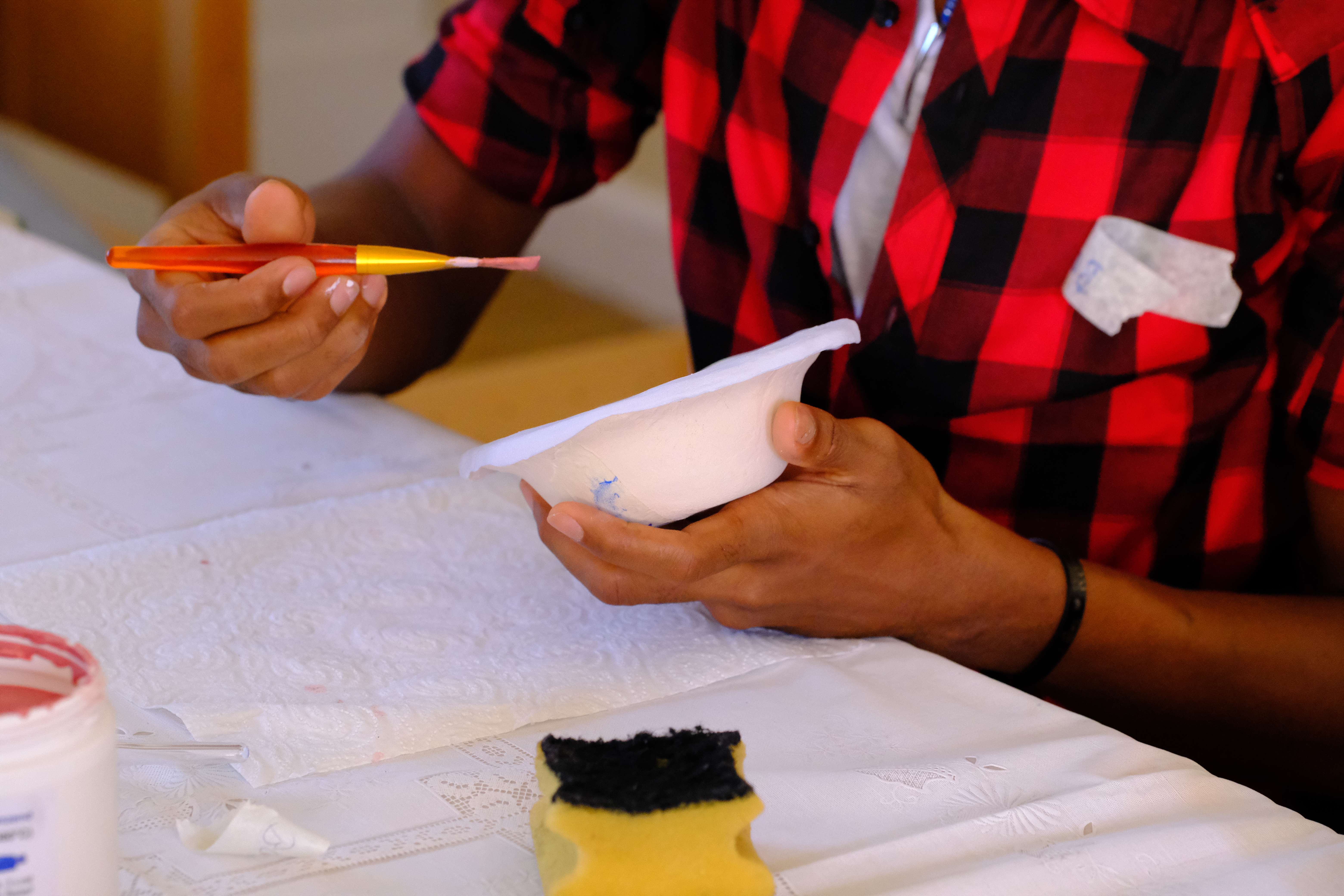 Integration ist keine Einbahnstraße - deshalb bemühen sich die beiden evangelischen Gemeinden immer wieder, die Geflüchteten aus ihrer Nachbarschaft kennenzulernen und einzuladen. Gemeinsam mit einer nahegelegenen Erstaufnahme kam so über die Projekte Welcome! und UMGeben der SozDia die Idee einer gemeinsamen Töpfersession auf. Am 31.08. konnten alle Kinder und Jugendlichen ihre eigene Schalen und Teller designen. Im Anschluss wurden die Stücke gebrannt und eine Woche später trafen sich alle wieder, um sie nach eigenem Wunsch zu bemalen. Nebenbei wurde gegessen, Kennenlernspiele waren Teil des Programms und "Tschüss" wurde auf allen anwesenden Muttersprachen gelernt.
