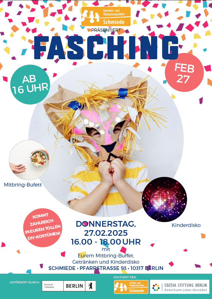 Wir erwarten euch in der Familien- und Begegnungsstätte Schmiede in der Pfarrstr. 93, 10317 Berlin.
